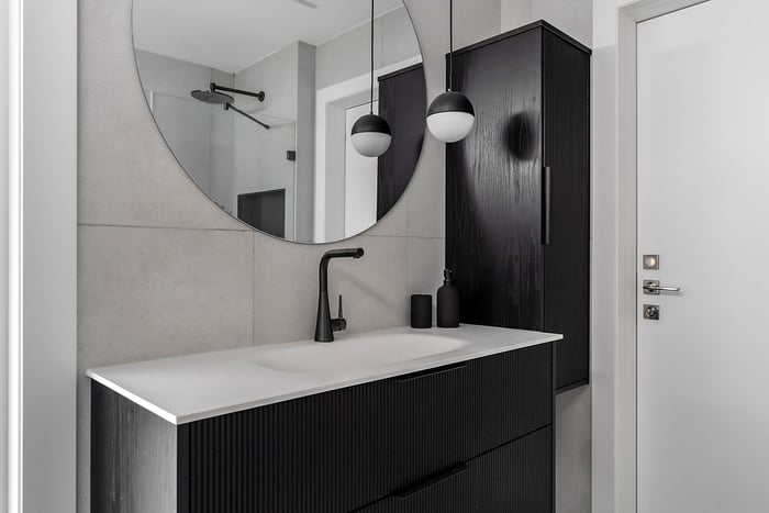 ריצוף וקירות - דגם 97021 דמוי אבן בז' 60*120, R10 נגד החלקה ארון בעיצוב אישי בגודל 120 + כיור קוריאן אינטגרלי + מראה עגולה מרחפת ארון שירות תואם בעיצוב אישי מעצבת: ליאת עסיג צילום: מאור מויאל