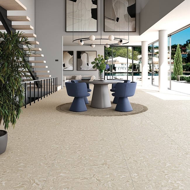 אריחי גרניט פורצלן דמוי שיש עוצרי נשימה בגוון בז. מט הקיימים בגודל מאה עשרים על מאה עשרים, מיועדים לבית, ומשרים אווירה ביתית.